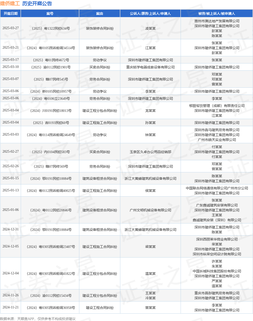 案号:(2025)赣07民终569号审理法院:江西省赣州市中级人民法院案由:劳务合同纠纷当事人信息: 原告/上诉人:深圳市建侨建工集团有限公司 被告/被上诉人:邓某某、曾某某开庭日期:2025年2月26日根据统计,近一年内以深圳市建侨建工集团有限公司为当事人的历史开庭公告有68则,其中案由为“建设工程分包合同纠纷”的公告以13则居首,其次为“劳务合同纠纷”有10则,“建设工程施工合同纠纷”有10则。历史开庭公告(前20条)如下: